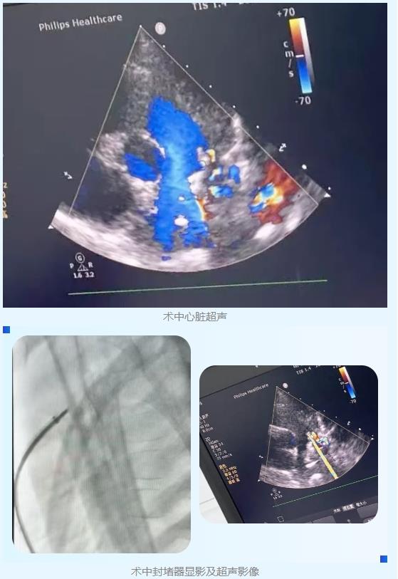 手术在麻醉手术科与超声医学科团队协作下开展,由交大一附院心血管外科成革胜教授带领榆林医院心血管外科医疗团队共同实施。术中团队根据患儿血管走行特点,及时调整手术路径,建立“股动脉-PDA(动脉导管未闭)-股静脉”轨道,手术全程用时20分钟,成功完成封堵手术。为提升手术安全性与术后恢复质量,术中全程在经胸超声监测下完成封堵器选择与封堵器封堵效果的评估,避免使用造影剂及放射线,最大限度降低肾损伤与辐射暴露风险。