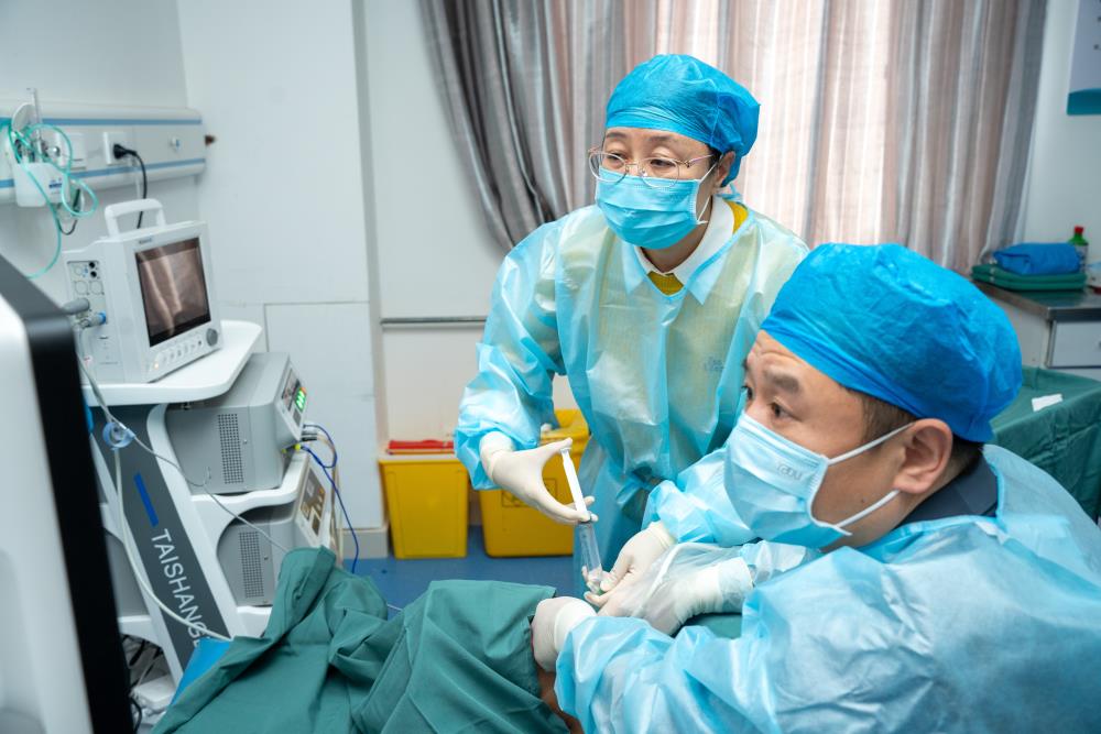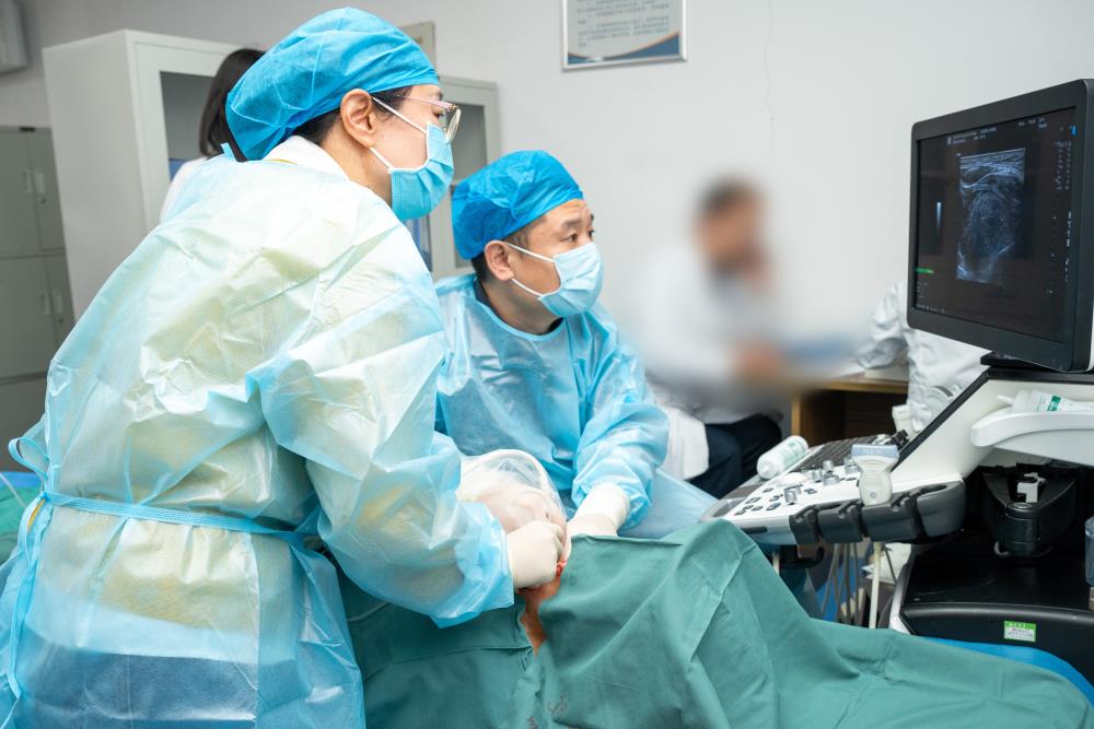 图片说明:魏炜主任、李彦青主任为患者实施超声引导下射频消融术