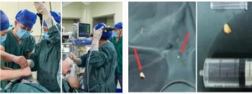 面对这一紧急情况医务部组织儿科、麻醉手术科、呼吸与危重症医学科、内镜中心、耳鼻咽喉科等科室的专家紧急在手术室召开多科会诊,重新评估病情并制定应急预案。在呼吸与危重症医学科尹建威副主任医师的协助下,再次予支气管异物网篮成功将半粒直径为8mm的花生米完整取出。随着异物的成功取出,小宝的血氧饱和度逐渐上升,喘鸣消失,高气道压下降,终于转危为安。