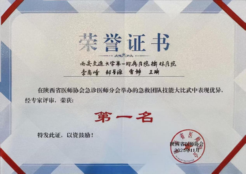 11月9日,为期三天的“2025陕西省医师协会急诊医师分会学术年会暨第九届古都急诊学术会议”在西安圆满落幕。会上,由我院急诊科组建的代表队凭借精湛技艺和卓越团队协作,在全省16支省市级强队中脱颖而出,斩获“急救团队技能大比武”一等奖,为医院急诊学科建设再添一枚“硬核勋章”。