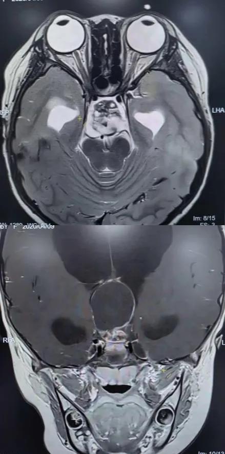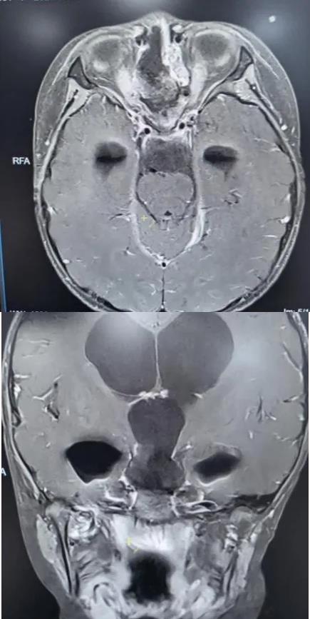 为精准掌握肿瘤情况,团队为欢欢完善了垂体MRI平扫+增强检查及相关激素水平检测。结果显示:肿瘤体积超过4厘米,形如鸡蛋,已严重压迫视神经与垂体,突入第三脑室,并与周围重要神经血管结构紧密粘连。颅咽管瘤是一种起源于颅底的先天性良性肿瘤,因体积大、位置深,且毗邻下丘脑、视神经、垂体等重要结构,手术切除难度极高,稍有不慎就可能导致失明、终身内分泌紊乱甚至有生命危险。