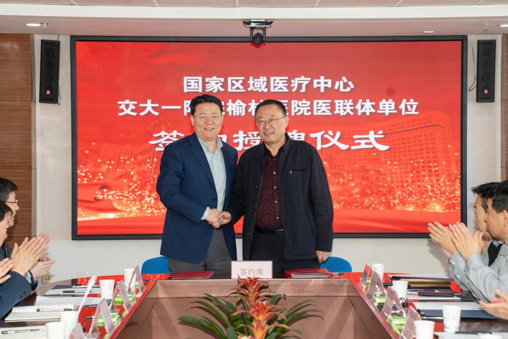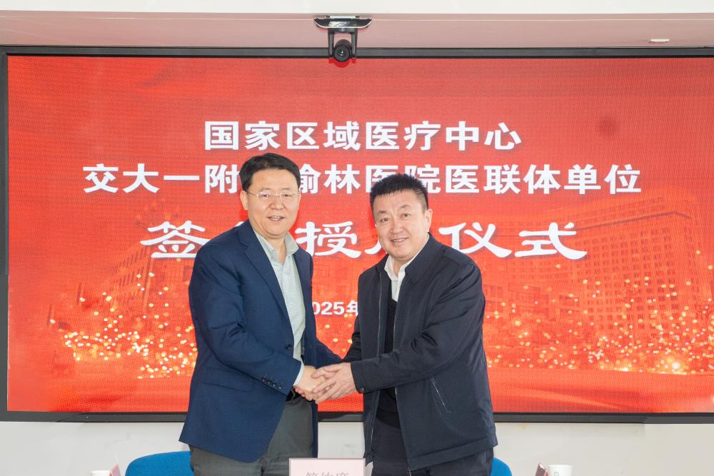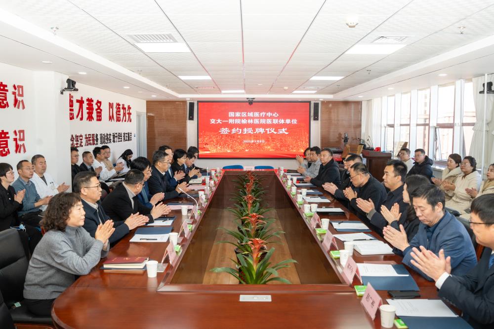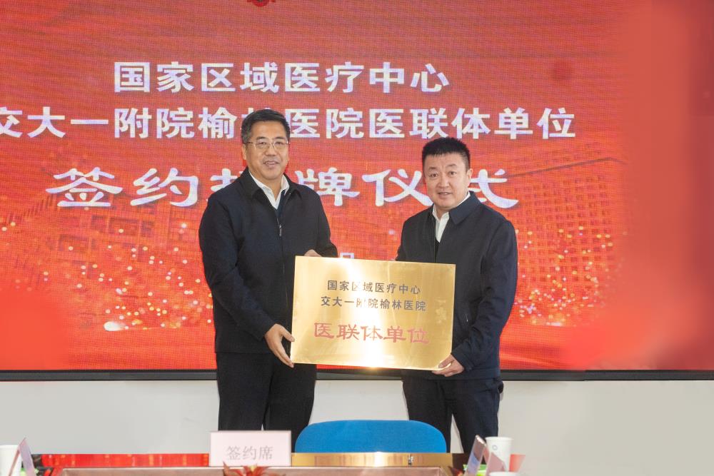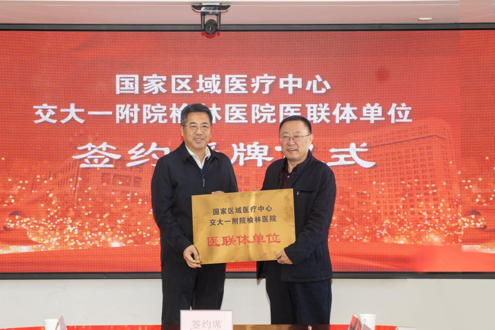1月8日上午,国家区域医疗中心交大一附院榆林医院医联体单位签约授牌仪式举行,交大一附院榆林医院与榆林市第三医院、榆林市第五医院达成医联体合作,这是我市促进优质医疗资源扩容下沉和区域均衡布局,加快建设分级诊疗体系,提升专科医院综合服务能力,改善患者就医感受的重要举措。榆林市卫健委党组书记、主任张军,交大一附院副院长、榆林医院执行院长佘军军,榆林市第三医院院长贺峰,榆林市第五医院院长薛玉旺及交大一附院榆林医院、榆林市第三医院、榆林市第五医院相关领导班子成员出席签约授牌仪式。交大一附院榆林医院党委书记赵文玉主持签约授牌仪式。