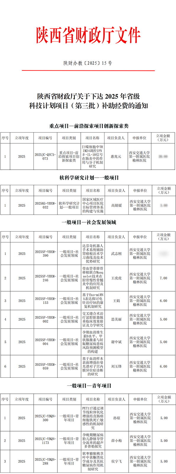 近日,陕西省科技厅正式公布 2025 年度科技计划项目立项名单,交大一附院榆林医院捷报频传,成功获批 11 项省级科技计划项目。获批项目类型涵盖多个重要领域。其中,省重点项目-前沿探索项目创新探索类获批1项,软科学研究计划项目获批1项,社会发展领域项目获批6项,青年项目获批3项,实现医院省级科研项目获批数量的历史性突破。这是继我院荣获陕西省科协青年人才托举计划项目和省、市级科技人才项目之后,取得的又一殊荣,为国家区域医疗中心建设再添强大助力。