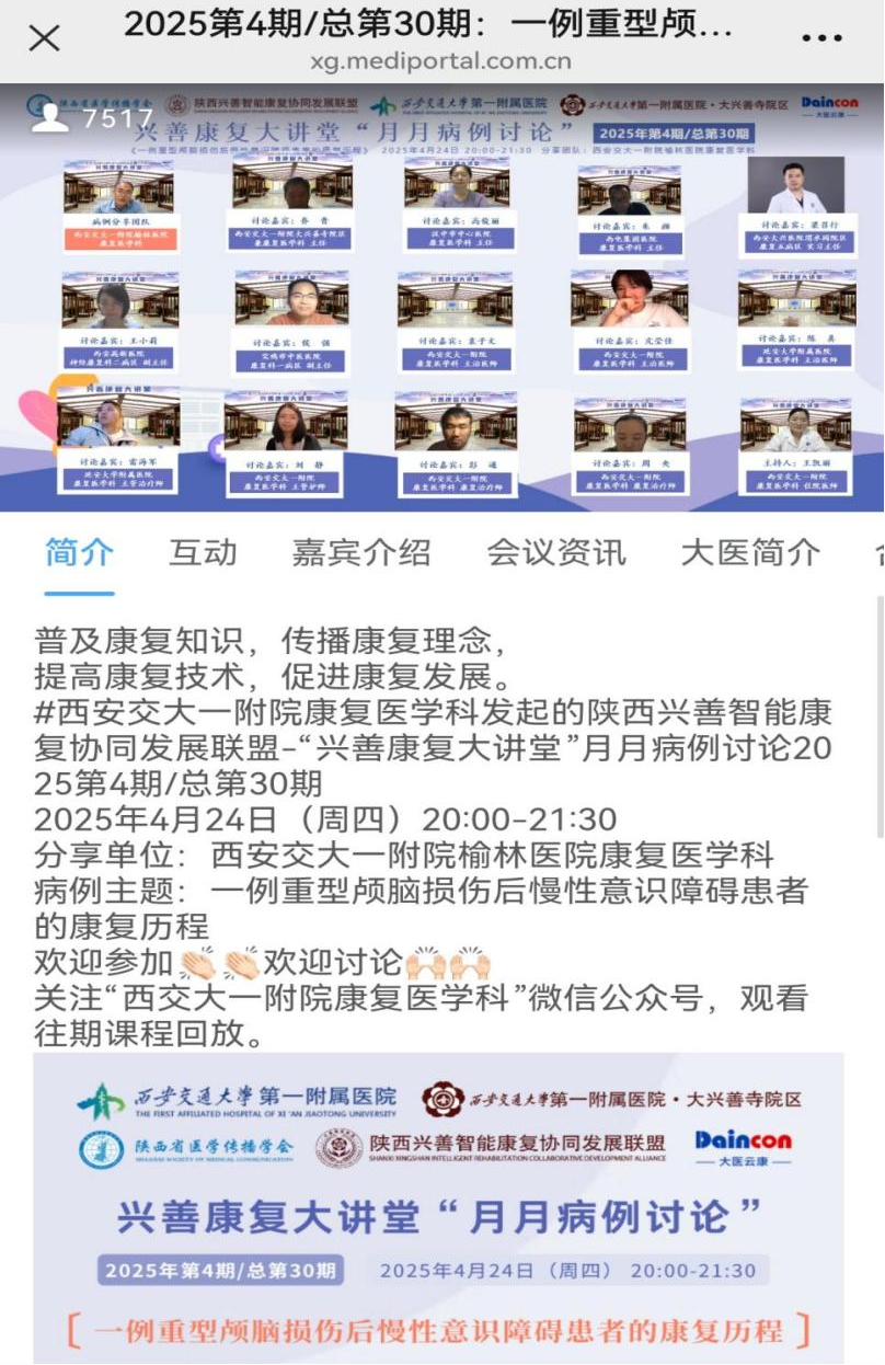 在西安交通大学第一附属医院牵头主办的“兴善康复大讲堂”病例汇报中,榆林医院康复医学科团队围绕技术亮点、人文关怀、区域引领等方面详细向大家分享了该病例的治疗策略与经验启示,引发线上7500余名参会者的热烈讨论,充分展现了交大一附院榆林医院在疑难康复领域的突破能力。同行专家纷纷表示,其“评估-干预-再评估”的动态闭环管理模式,对全省意识障碍康复标准化建设积累了经验。