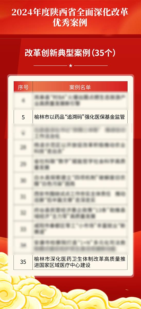 2024年度陕西省全面深化改革优秀案例评选活动,突出先进性、代表性、创新性和示范性,以谋划、推动、落实改革的实效和贡献大小作为主要衡量标准,共60个优秀案例入选。其中,涉及交大一附院榆林医院《榆林市以药品“追溯码”强化医保基金监管》、《榆林市深化医药卫生体制改革高质量推进国家区域医疗中心建设》两个案例入选2024年度陕西省全面深化改革优秀案例之改革创新典型案例。