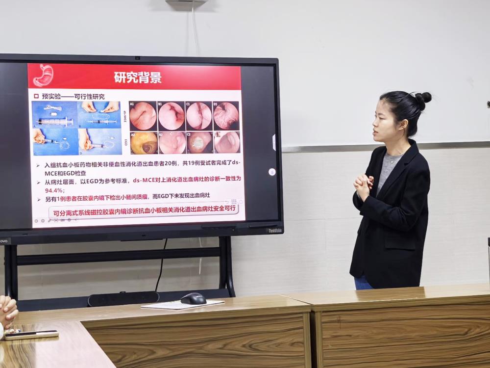 长海医院消化内科陈逸致医师详细阐述了项目的研发背景、研究目的及研究意义。此研究项目旨在以胃镜为参考标准,评估磁控胶囊内镜在抗血小板药物相关消化道出血患者的诊断效能,评估其应用在此类患者管理的可行性和安全性。