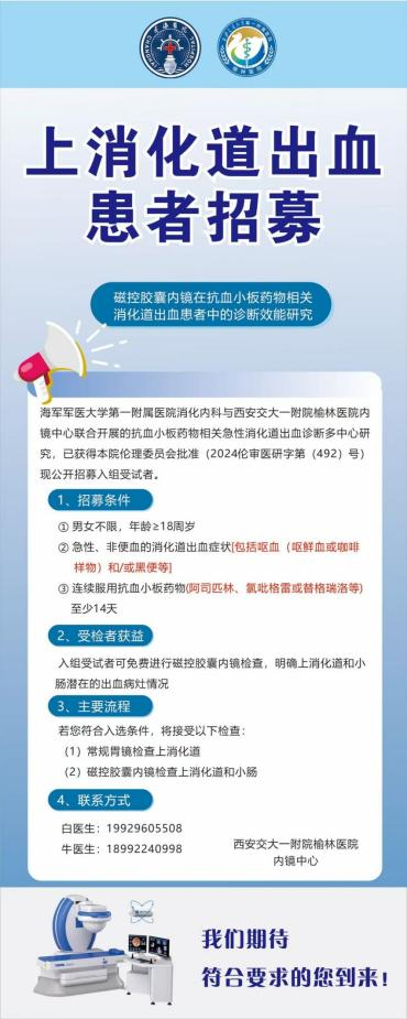 抗血小板药物是心脑血管疾病治疗的基石,但长期使用此类药物可能会出现消化道出血等并发症。一般情况下,患者需要完善常规胃镜检查来明确诊断,指导下一步治疗。现为了更好地明确胃肠道黏膜损伤情况,由上海长海医院发起,交大一附院总院和榆林医院同时参与并开展了“抗血小板药物相关上消化道出血的全国多中心临床研究”,针对符合条件的患者,我们将免费提供价值几千元的胶囊内镜检查,在观察胃粘膜情况同时,还可以明确小肠黏膜有无出血,从而为患者带来更大的收益。