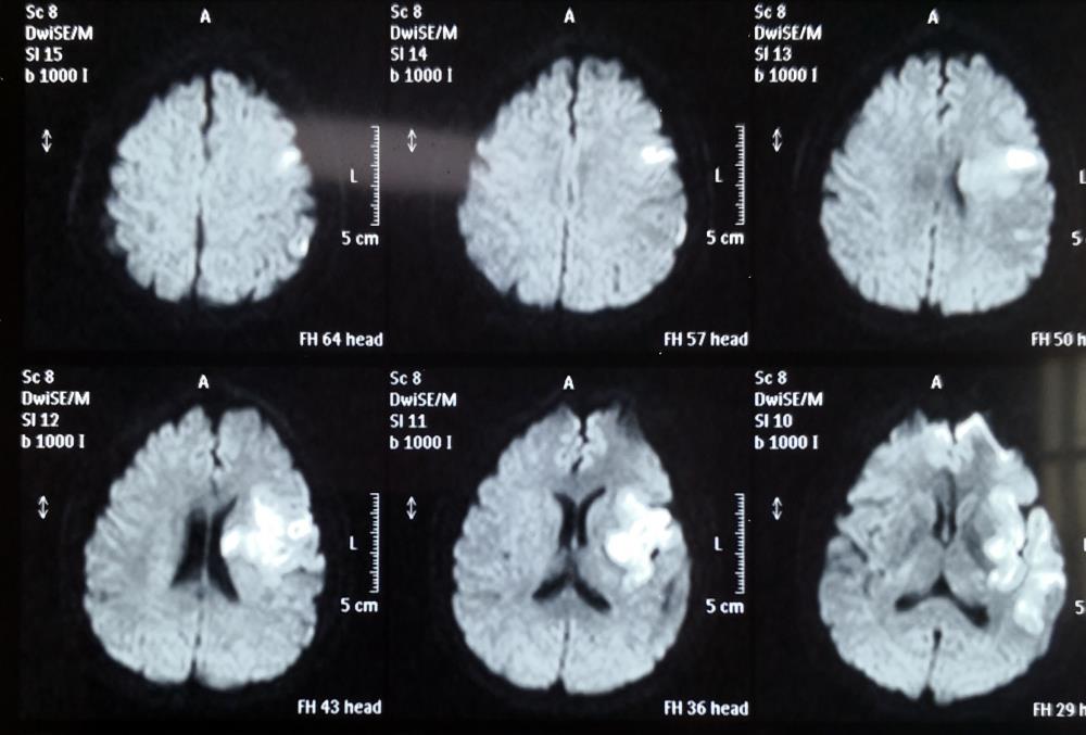 2020年12月14日上午9点左右,59岁的胡某在家中突然昏迷,由120送至榆林二院急诊,入院时患者神志模糊,四肢无法活动,不能言语。急诊行头颅DWI+MRA检查提示:左侧大脑半球新发大面积梗死,左侧大脑中动脉闭塞。