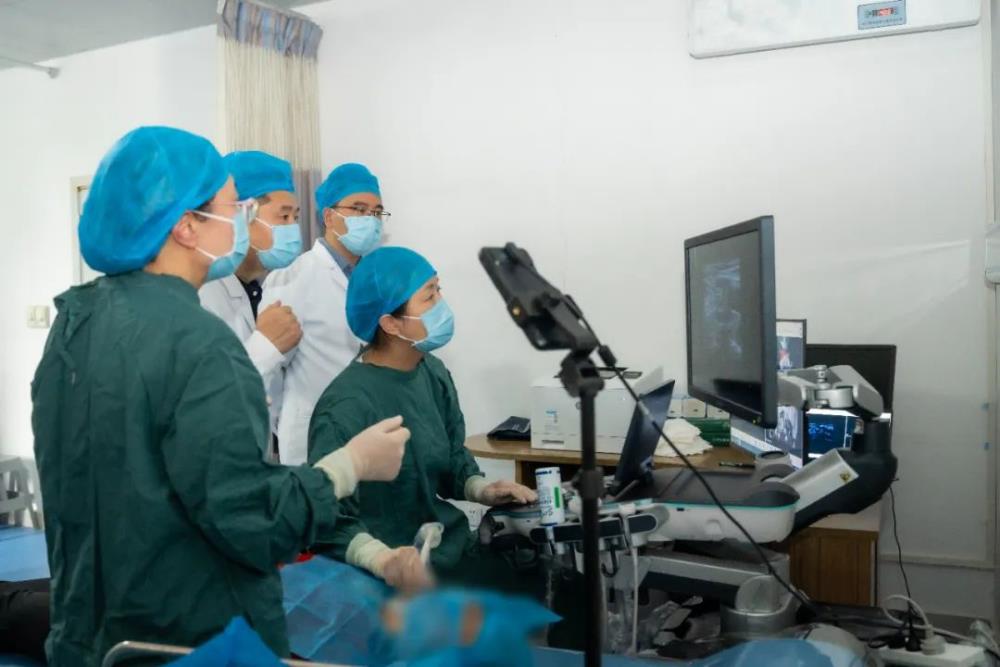 会诊过程中,超声医学科主任李彦青,副主任朱艳两位主任医师将甲状腺及引流区淋巴结二维图像和血流信息实时扫查,5G远程实时将图像传送院本部会诊室显示大屏,阮骊韬教授实时观察并远程指导,提出了诊断思路及必要的穿刺部位建议,李彦青主任团队在阮教授的指导下,规范的完成了对两位患者高风险甲状腺结节及可疑引流区异常淋巴结等共6个部位的细针穿刺活检,取材满意。
