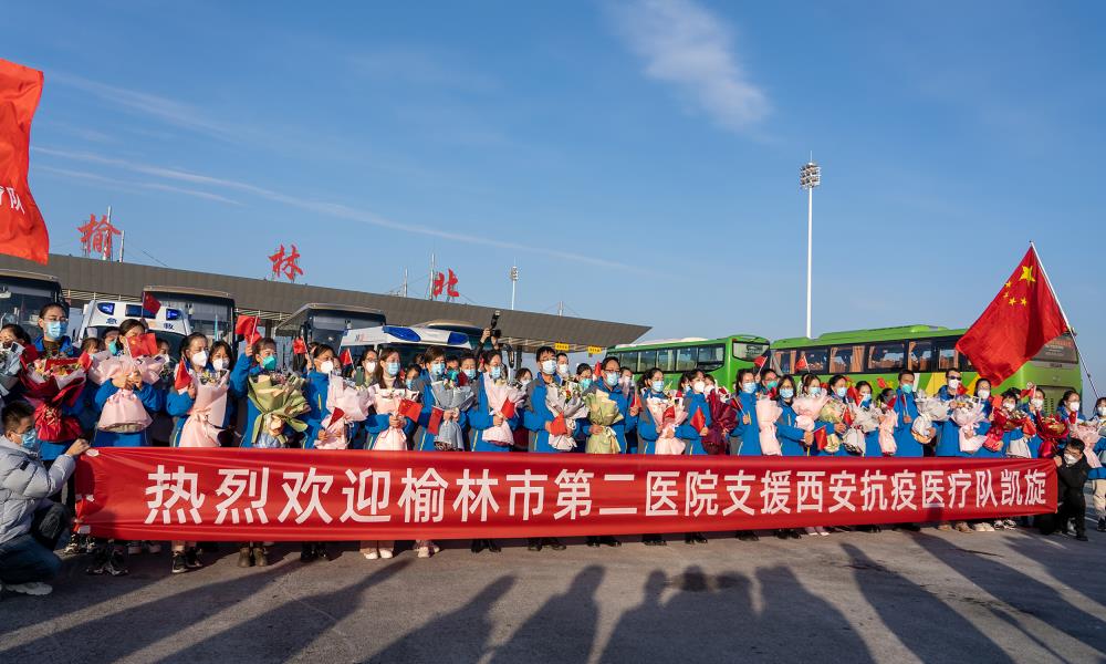 榆林二院医务人员白衣为甲、逆行出征,共16批134人次分赴武汉、北京、太原、乌鲁木齐、西安、延安、吉林等地参加疫情防控。组建70人的整建制医疗队支援西安,不负重托、精准施治,经过15天的连续奋战,终实现了收治患者零死亡、医护人员零感染、诊疗工作零差错的目标,为医院积累了丰富的实战经验。现在,仍有5名医护人员依然坚守在吉林省疫情防控一线。