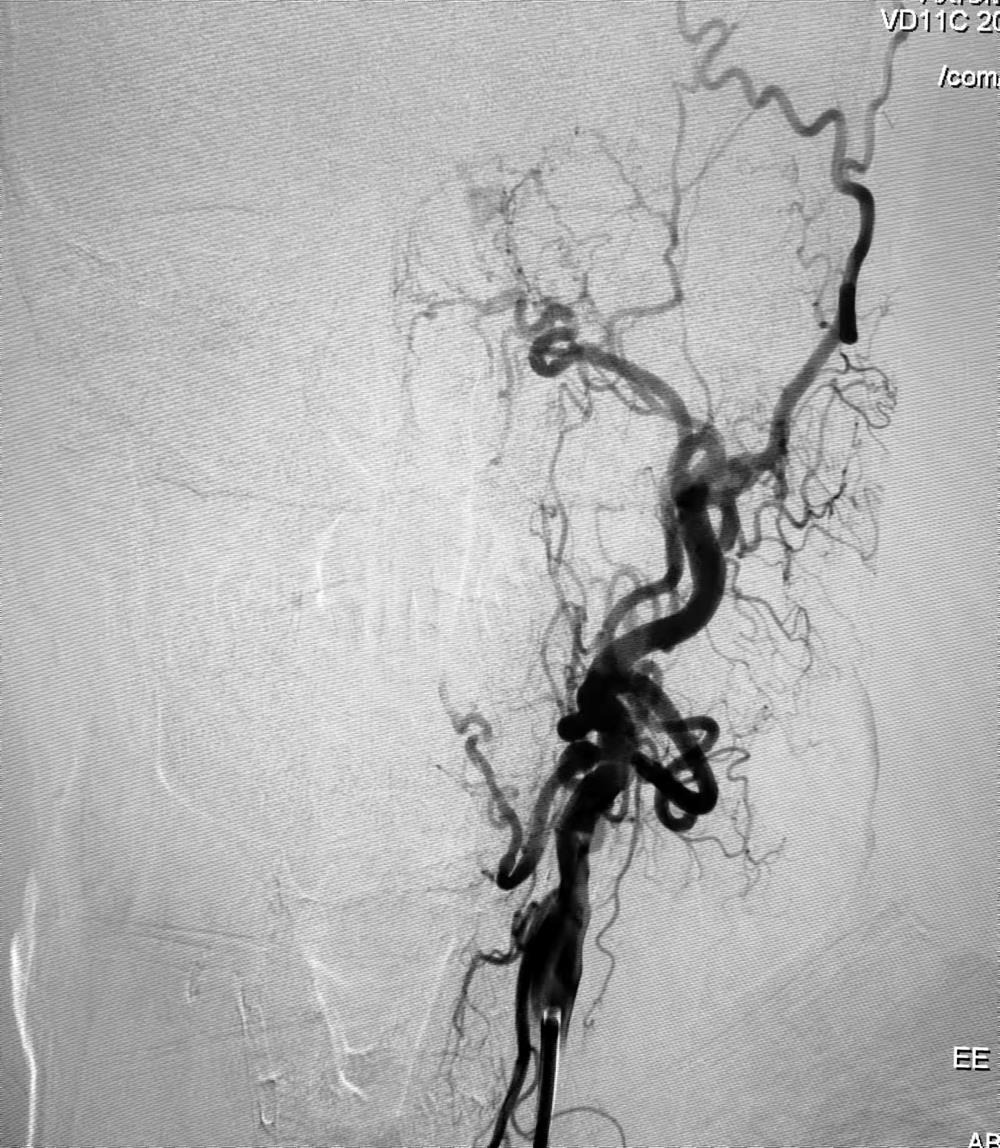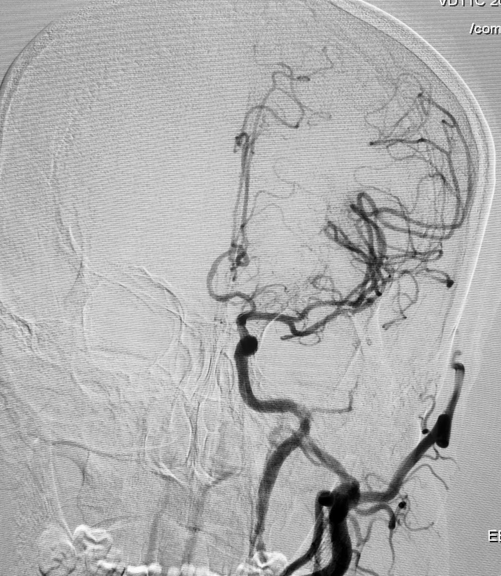 经过周密的术前准备,脑科医院神经介入团队在局麻下为该患者施行左侧颈内动脉闭塞开通术,术中成功植入一枚颈内动脉支架,术后即刻颈内动脉血流通畅,分支血管显影良好。