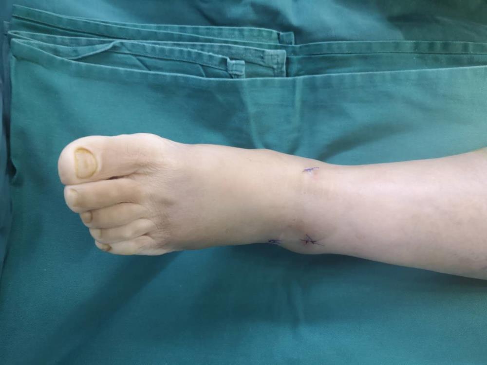 患者踝关节反复扭伤多次,现踝关节疼痛,影响行走功能及日常生活。曾多次在多家医院门诊就诊,保守治疗无明显效果。来我院就诊后诊断,踝关节距骨软骨损伤,踝关节慢性不稳。给予保守药物治疗及康复治疗,效果不明显。经我院足踝外科专业组专家讨论拟定行踝关节镜下手术治疗。