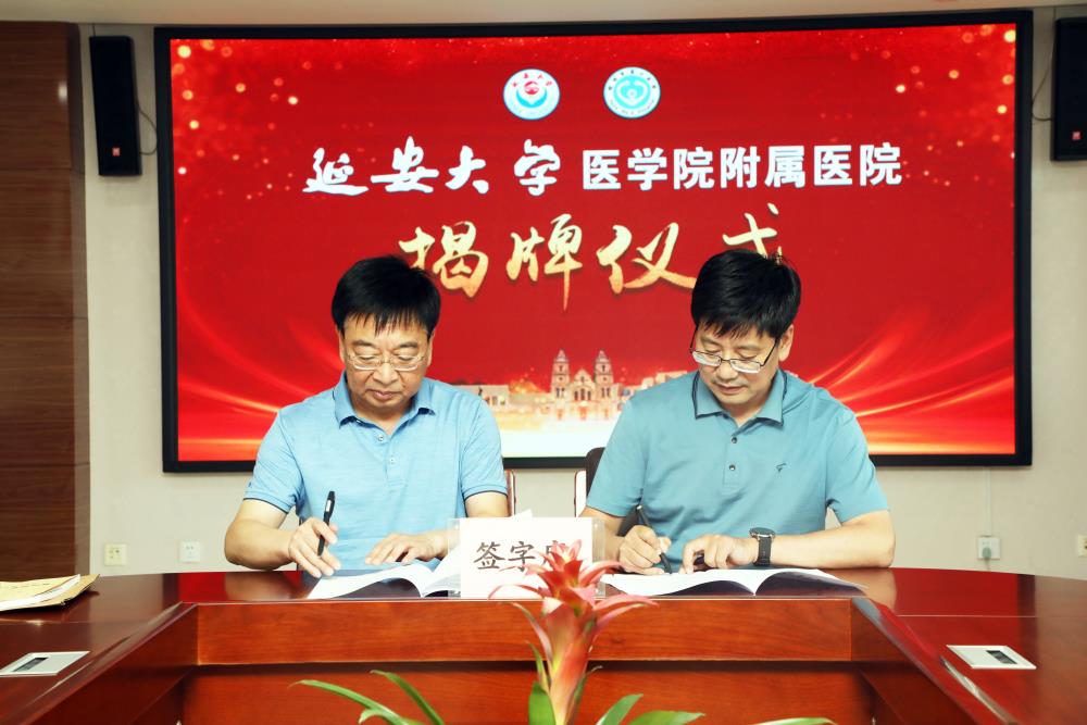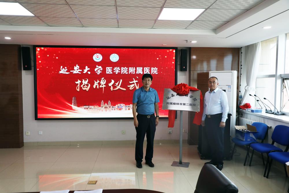 会上,刘晓斌副院长与赵文玉书记签约,并与榆林市卫健委副主任王东林共同为附属医院揭牌。