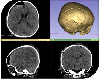 术后骨瓣还纳,为大程度减小手术切口及不影响患儿以后颅骨的生长发育,采用精准影像融合技术定位,以及可吸收颅骨锁固定骨瓣,手术顺利。术后在重症医学科严密观察患儿意识及生命体征,48 小时后患儿各项生命体征平稳,转回神经外科一病区继续治疗。