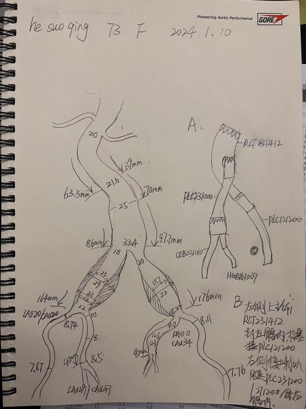 入院后,经详细检查,发现彭奶奶动脉瘤解剖形态复杂,入路血管狭窄扭曲,介入血管外科主任刘建林教授组织全科讨论,大家一致认为,若釆用外科开刀手术,切除血管瘤人工血管移植,创伤大,手术并发症多,加上患者年事已高,体重不足100斤,好采用微创治疗。釆用常规覆膜支架腔内手术,因患者入路血管狭窄扭曲,支架系统难于到位,也可能导致手术失败。经再三讨论,后决定釆用国产原创超细输送系统腹膜支架(Minas)治疗该例患者。