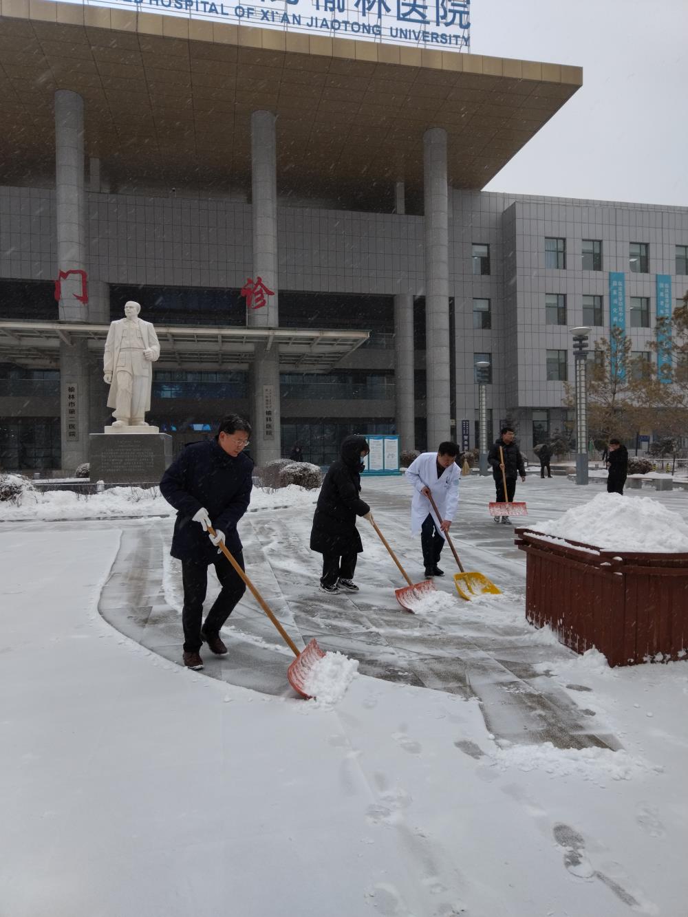 当天上午,西安交大一附院榆林医院同样开展了扫雪除冰行动,保障医院周边各条道路的畅通,排除了因冰雪带来的不便。