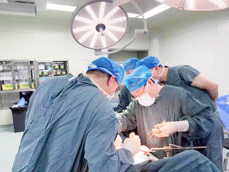 入院时,患者皮肤发黄、腹胀严重,并出现弥漫性腹膜炎、感染性休克和气短,被立即收住重症监护室。行诊断性腹腔穿刺,抽出黄色混浊液体。白纪刚教授和榆林医院普通外科二病区乔培宇主任团队对患者病史和病情分析,考虑胆道损伤、胆瘘,因患者病情危重,随时危及生命,遂当机立断,迅速协调相关科室,进行急诊手术。
