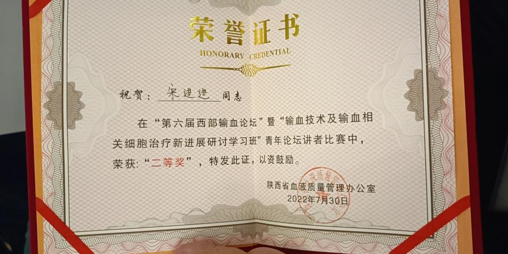 其中,输血青年论坛讲者比赛经过全省范围内医疗机构和采供血机构的初筛后,共有21人参赛。通过激烈的角逐,我院输血科宋进进在比赛中荣获第二名,得到了评委们的高度点评。输血青年论坛讲者比赛作为本次学术活动的重要环节,旨在为陕西省各地区的参赛选手提供互相切磋、互相学习、共同进步的平台。