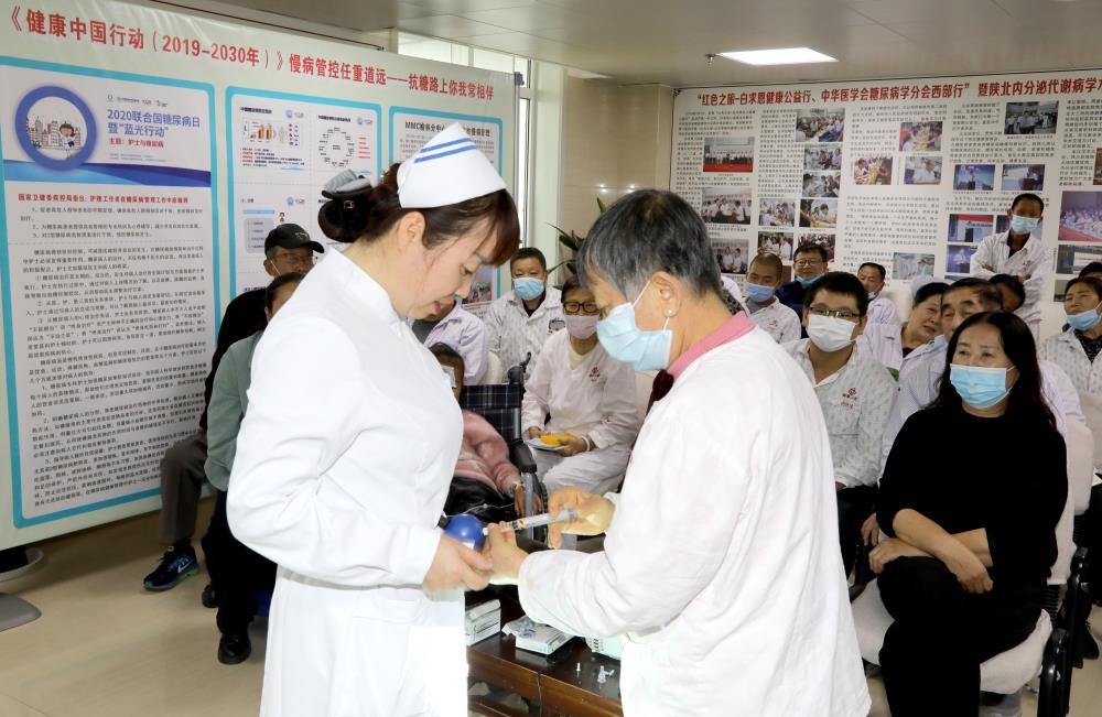11月13日下午,榆林二院内分泌科举办“护士与糖尿病”为主题的糖尿病防控健康宣教,组织广大病患观看糖尿病科普视频、对于注射胰岛素的患者如何进行废弃针头的处置进行讲解,并组织参观糖尿病一站式服务中心MMC,同时为与会者免费测量BMI。