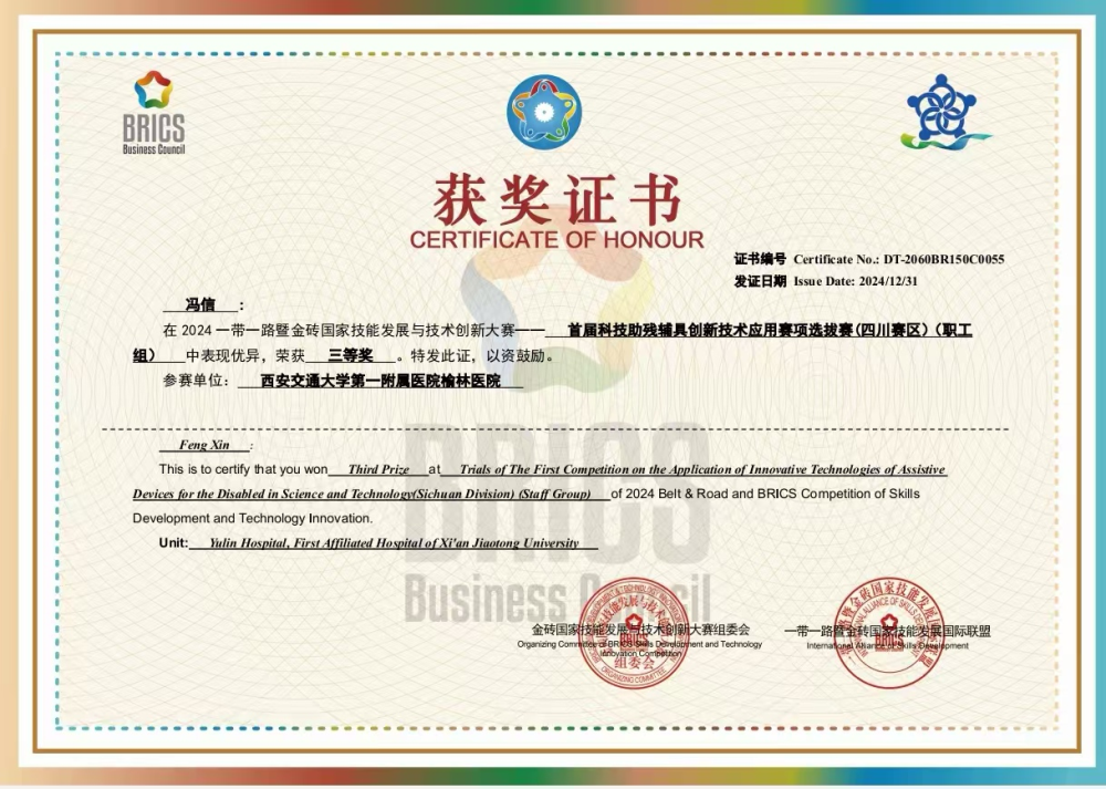 近日,由金砖国家工商理事会中方理事会、一带一路暨金砖国家技能发展国际联盟、中国科协一带一路暨金砖国家技能发展与技术创新培训中心等单位主办的2024一带一路暨金砖国家技能发展与技术创新大赛——首届听力言语残疾预防与康复技能赛项、首届科技助残辅具创新技术应用赛项选拔赛(四川赛区)落下帷幕。交大一附院榆林医院康复医学科主管治疗师冯信凭借扎实的专业知识和精湛的实操技能,在比赛中脱颖而出,荣获三等奖。