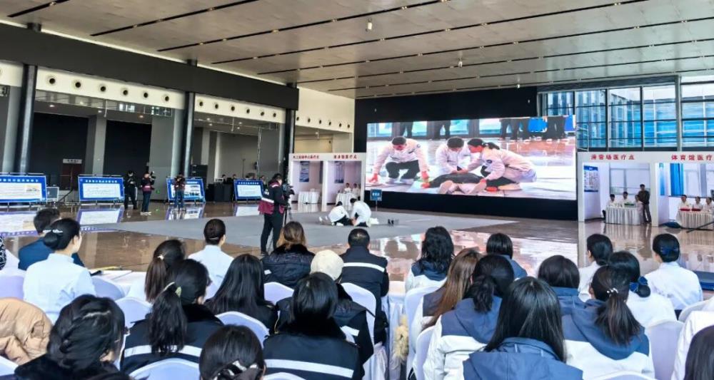 为保障赛事顺利开展,医院牵头制定冬运会医疗保障方案及应急预案,细化了踩踏、群体食物中毒、突发心脑血管事件等处置预案,并将预案转化为实战能力。2025年12月23日,医院在榆林会展中心主导开展冬运会全流程医疗救治与公共卫生应急演练。演练采用视频模拟与实景操作相结合的方式,高度还原赛事伤病场景:失温救治环节,团队快速完成转运、复温与生命体征维护;模拟冰刀切割伤处置中,规范运用加压包扎与止血带技术有效控制出血;针对骨折伤员,精准实施脊柱固定、支具外固定及平稳转运。演练完整覆盖从现场初步评估、AED除颤到院内绿色通道开启、多学科联合救治的全过程,全面锤炼团队在复杂情况下的协同作战与应急处置能力。
