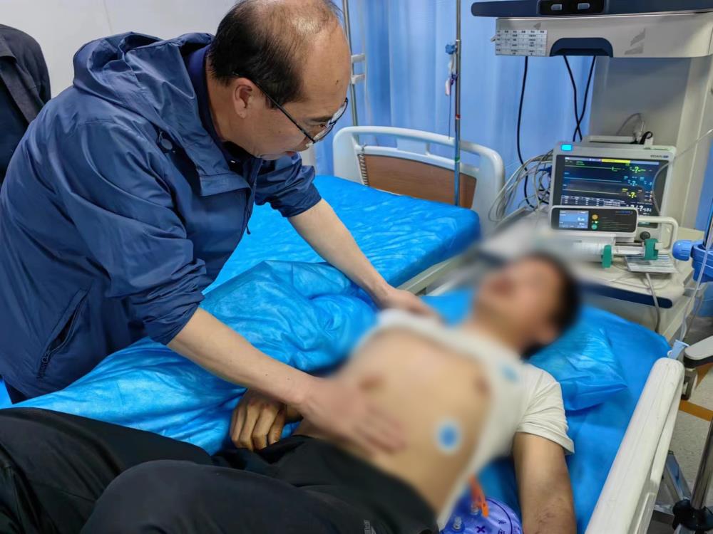 白纪刚教授在榆林医院普通外科二病区查房后,就地赶往手术室,完成了一台胆囊癌根治术。4月22日,晚上9点,刚刚回到住地,便接到了急诊医学科的紧急电话,有位车祸患者正从横山区向西安交大一附院榆林医院转诊,请他前来会诊。白纪刚教授接到电话后,便与西安交大一附院驻榆林医院急诊科王军教授火速赶往医院。