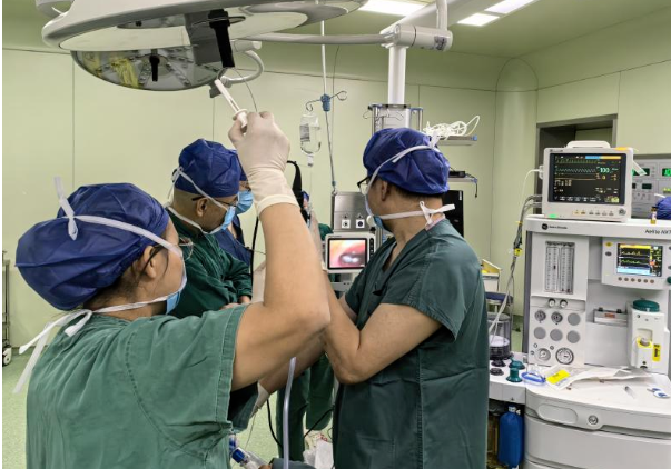 此次手术难度极大,麻醉医师和手术医师需共用一个狭小的气管通道,既要维持患儿氧合与麻醉深度,又要确保其术后快速平稳恢复。麻醉手术科惠勇主任与儿科团队共同对患儿的情况、麻醉及手术风险进行全面评估,麻醉手术科党炳文副主任则与家属充分沟通,详细告知手术相关风险,并备好急救复苏药品及物品,为手术做好充分准备。患儿进入手术室后,医护人员首先给予面罩吸氧,初步改善其缺氧状况,提高机体氧储备,随后顺利置入喉罩。由于孩子气道压高,手术耐受度差,可供内镜下操作的时间极短,给手术带来了极大的挑战。