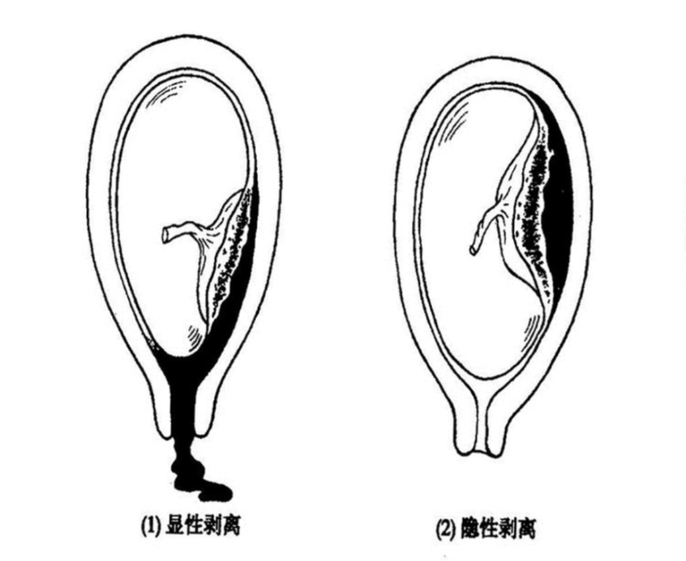 显性剥离:胎盘剥离形成较大的胎盘后血肿,血液冲开胎盘边缘及胎膜,经宫颈管流出。