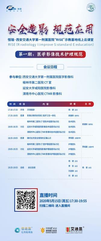 在新冠疫情进入常态化管理的当下,为了提高业务水平,加快推动重点专科发展,避免线下人员聚集,2020年5月15日下午西安交通大学第一附属医院影像科、榆林市第二医院影像中心CT室、延安大学咸阳医院影像科、渭南市中心医院影像科共同开展“安全造影,规范应用”线上云课堂,第一期主题为“医学影像技术护理规范”。