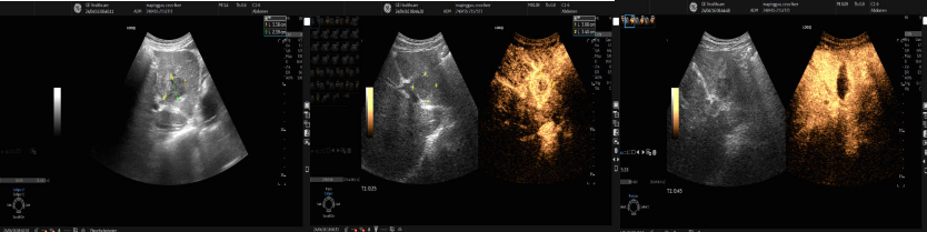 肿瘤科病区一名68岁的患者胰腺肿瘤术后肝脏转移,肿瘤位于肝脏S3段,大小31x30mm,被门静脉左外支上段、左外支下段及左支矢状部三面包绕,穿刺风险较高,经魏炜教授严谨会诊及精准规划定位,完美避开肿瘤周围血管,采用功率120W,累计用时10分钟完成射频消融,消融后即刻超声造影显示消融范围完全覆盖原肿瘤区域,解除了患者疾患,且整个过程患者无明显不适,实现了微创治疗。