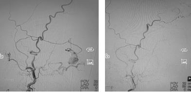 纪文军主任团队制定好手术方案后,快速完善术前准备,争分夺秒,完成术前相关检查,并将常师傅送入介入手术室。在神经外科二病区纪文军主任医师、李涛副主任医师、张伟副主任医师、赵乐副主任医师及麻醉手术科工作人员的紧密协作下,历经约2小时手术,确认病因为后颅窝硬脑膜动静脉瘘合并巨大的静脉瘤破裂出血。术中,团队逐一对硬脑膜动静脉瘘多支供血动脉进行栓塞,术后脑血管造影显示硬脑膜动静脉瘘近全栓塞,巨大静脉瘤不显影。