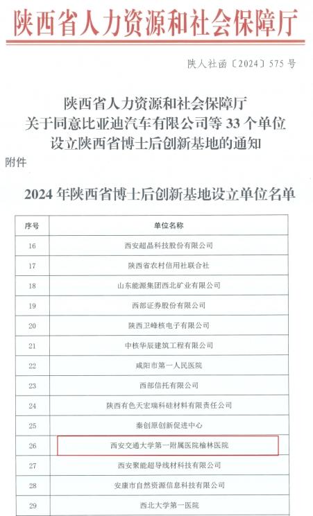 近日,陕西省人力资源和社会保障厅发布通知,批准在西安交通大学第一附属医院榆林医院(以下简称交大一附院榆林医院)在内的33家单位设立陕西省博士后创新基地。我院在医疗科研领域迈上了新的台阶,为医院未来的发展注入了新的活力。