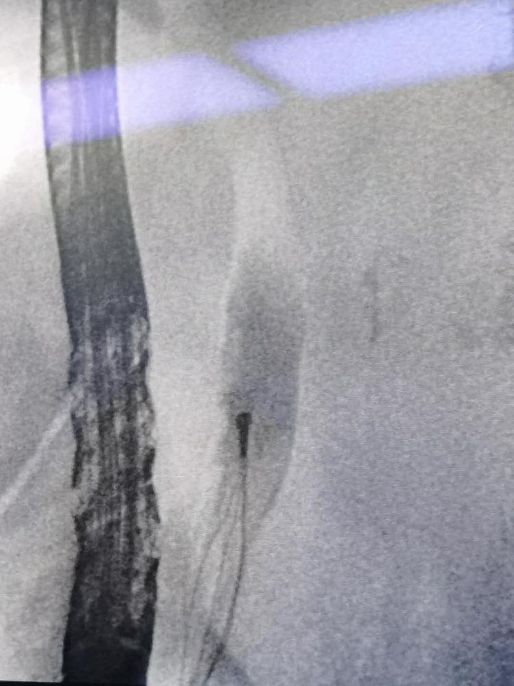 术中:经导丝置入塑料支架,胆汁引流通畅